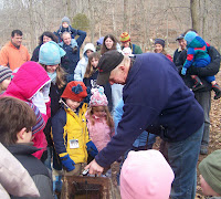 The Discovery Center took a trip to Topstone Farm in Redding yesterday for a demonstration of maple sugaring. Mr. Bronson showed us how he taps trees, collects sap, and boils it down to delicious real maple syrup. He had lots of helpers with Discovery Center kids who helped drill the hole in the tree, put in the tap, read the thermometers, and of course taste the sap!