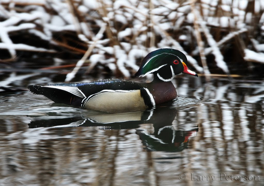 Yesterday was the spring equinox, Ostara the druids called it. It is the day when daylight and night time are about equal. But in nature, this is but a blur in the rotating seasons. In Ridgebury it is snowing hard today. Dog and I walked around the golf course noticing all the signs that our time out there is limited. Benches, trashcans, containers of sand are all out waiting for the “golfermen”. Yet winter hangs on in our every footprint with snow clinging to my boots & Dog’s fur. The hunter’s feeding station is still there. Winter’s woody debris is still scattered about the fairways. But the ponds no longer are covered in their mantle of ice. Geese cruise on one and Dog has spooked some wood ducks out of another. Skunk cabbage is well into its blooming phase with some leaves even unrolling in places. Man declares it Spring but for nature it is tug-of-war time between the seasons. Photo: Wood Duck by Larry Peterson - http://www.pbase.com/larry1dmarkiii/image/95034506/original