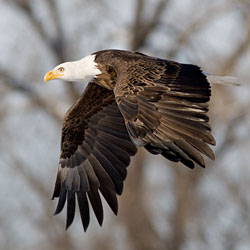 Haliaeetus leucocephalus is the scientific name for America’s National Bird. It means a sea (halo) eagle (aeetos) with a white (leukos) head (cephalus). At one time, bald meant white not hairless. It is called a sea eagle because of its preference for eating fish although it does eat carrion, smaller birds and rodents. Eagles differ from other birds of prey mainly by their larger size, more powerful build and heavier head and beak. The average adult bald eagle measures approximately 3 feet in length (males are smaller); females have a wingspan of 7 feet while males average 6 feet. Although they only weigh 8-9 lbs (male) 10-14 lbs (female), they can lift about 4 pounds. They live for 20 – 30 years. Eagles mate for life and an established pair may use the same nest for many years. They lay 1-3 eggs. Their chicks fledge in about 20 weeks but don’t reach sexual maturity and their full adult plumage for 4 – 5 years. The Bald Eagle is native only to North America. This is one of the reasons, along with its majestic beauty, great strength, and long life that it was chosen as our National Emblem on June 20, 1782. Second runner up was the American Turkey.
