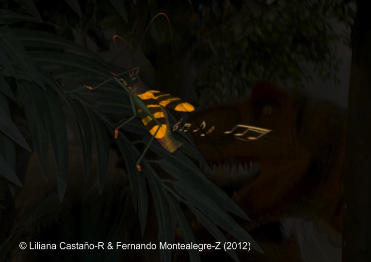 In China, a 165-million-year-old fossil of a Jurassic era katydid, Archaboilus musicus, was unearthed. Its wings were so well preserved that scientists have been able to analysis them and recreate the sound they produced. The insect was about 4” long with wings about 2.7” long. The male’s wings are designed to be sound generators. One edge had a row of teeth like a file. The other was designed like a scraper. When the wings are closed, the teeth are rubbed against the scraper to produce a sound, which is amplified by the wing membranes. Modern day katydids are designed similarly and use their call to lure a mate. By comparing the wings against 59 modern day katydids, scientists were able to determine they produced a high-frequency tone similar to modern day crickets. To determine how often they sang, scientists compared the fossil to present day Malaysian katydids that are about the same size and live on an island without bats. To avoid bats, most katydids have evolved a lower frequency sound sung at a slower rate. Jurassic katydids did not have to deal with the later evolving bats. From this they theorized that the ancient katydid sang out a few times every second. From these findings and other fossils, the high-frequency calls may go back to the Triassic period 250 – 200 million years ago. This study was published Feb 6, 2012 in the journal Proceedings of the National Academies of Sciences. Live Science web-site has posted this image and the sound. To hear it: Click Here. (Image: Lillian Castano-R & Fernado Monealegre-Z (2012)
