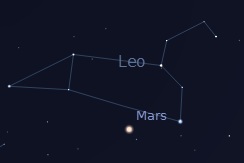 If you face south and look high in the sky, you'll see a very bright reddish object. That's Mars, which is now in the constellation of Leo, the Lion.