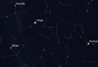 To the west and north is Deneb, in the constellation Cygnus (the Swan,